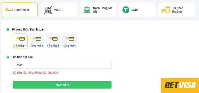 Hướng dẫn các bước nạp tiền vào tài khoản nhà cái Betvisa: