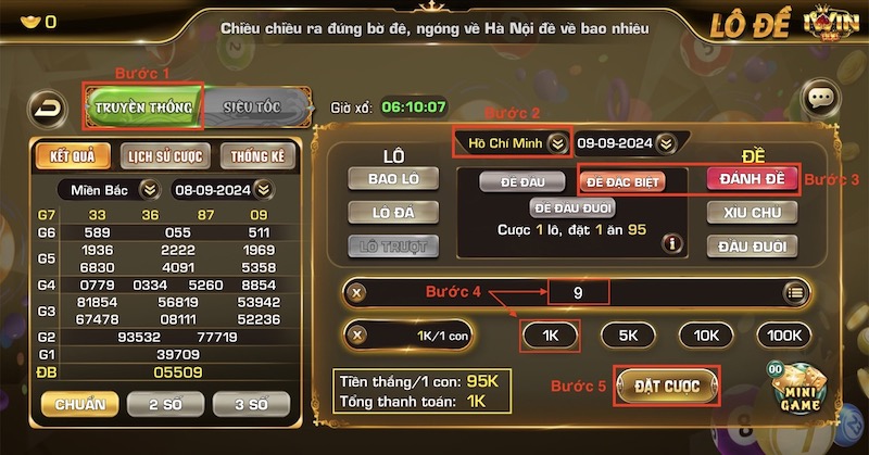 VD: Đánh 1K cho số 9, tổng thanh toán: 1K, Nếu giải ĐB là xxx9x thì tiền thắng: 1K x 9,5 = 9,5K